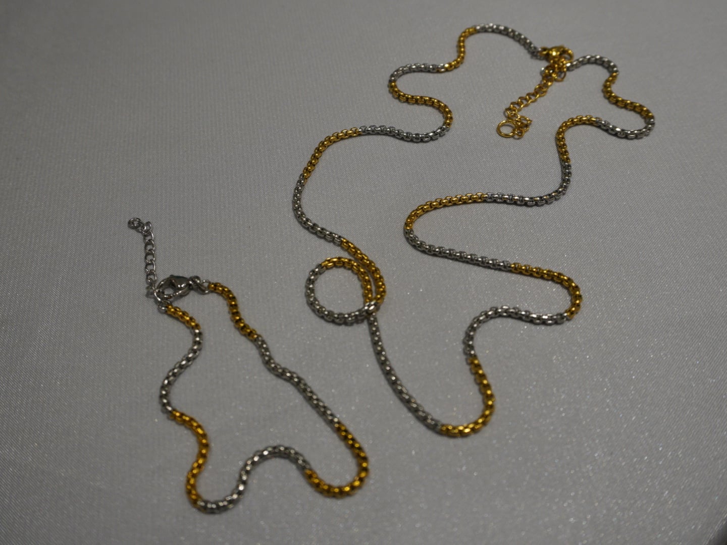 silver × goldがランダムに連なるデザインチェーンネックレス。