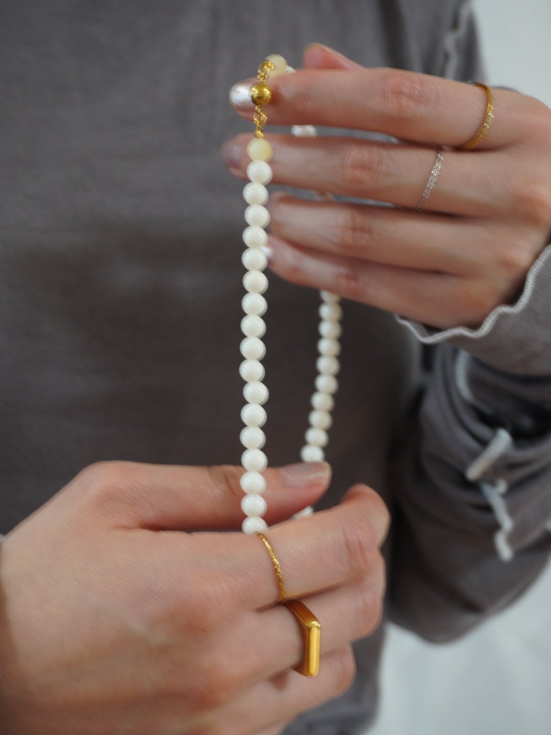 落ち着いたホワイトカラーが上品なホワイトコーラル(白珊瑚)。 ゴールドカラーのガラスビーズを間に入れる事で、しなやかで一際目を引くネックレスに仕上がりました。 ・size : 全長約37cm+アジャスター5cm ・素材 : サージカルステンレス(金具部分)/ 天然石 / ガラスビーズ